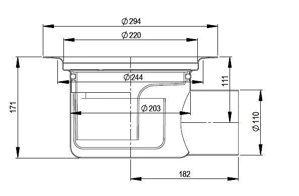 The Bigg 110 R floor drain is a horizontal drain with a 110 mm sewer connection, suitable for installation in concrete structures.