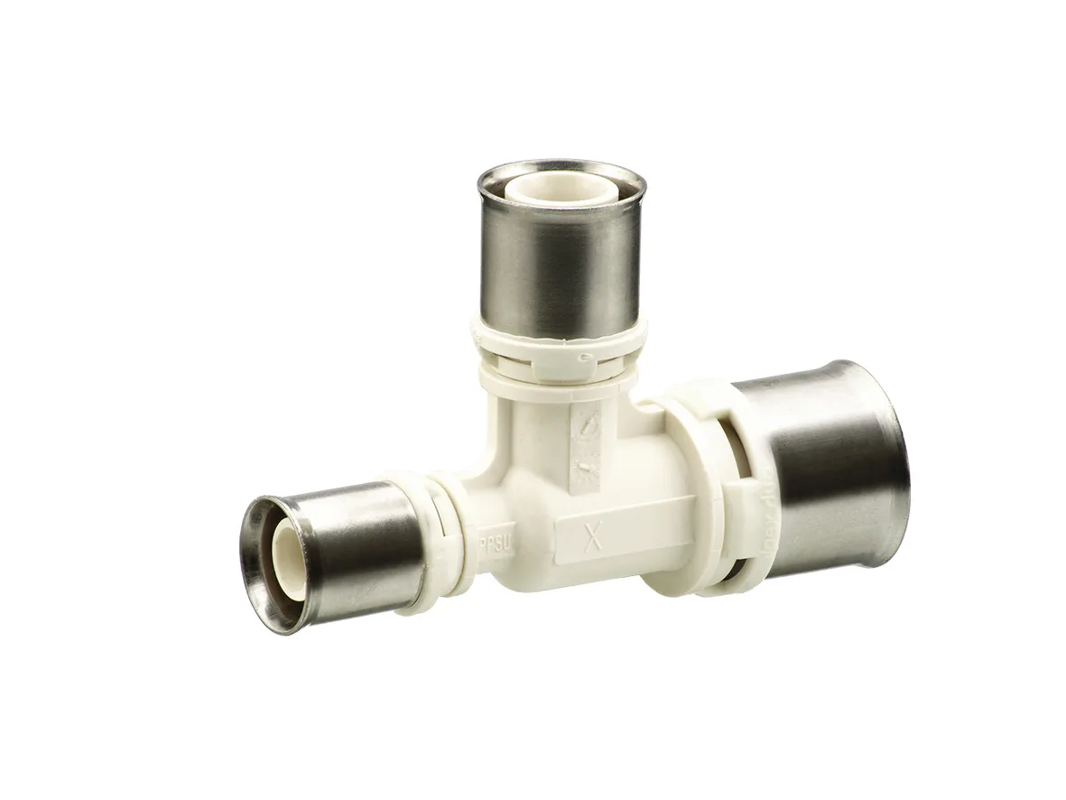 T-fitting with compression joints for connecting composite pipes in water, heating, and cooling installations.