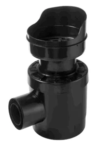 MELTEX 600/315/150 R drainage chamber has a 110 mm inlet with a ball check valve, preventing backflow into the drainage pipe if the water level rises, e.g. due to blockage. The outlet features a water trap and a flushing pipe, and can be opened to 110, 160, or 200 mm depending on requirements. The chamber includes a 150-liter sediment trap and has a total height of 1550 mm.