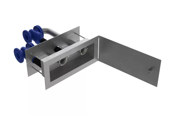 A wall-mounted fire hydrant with two connection flanges as a water intake point for the fire department on the exterior wall of the property.