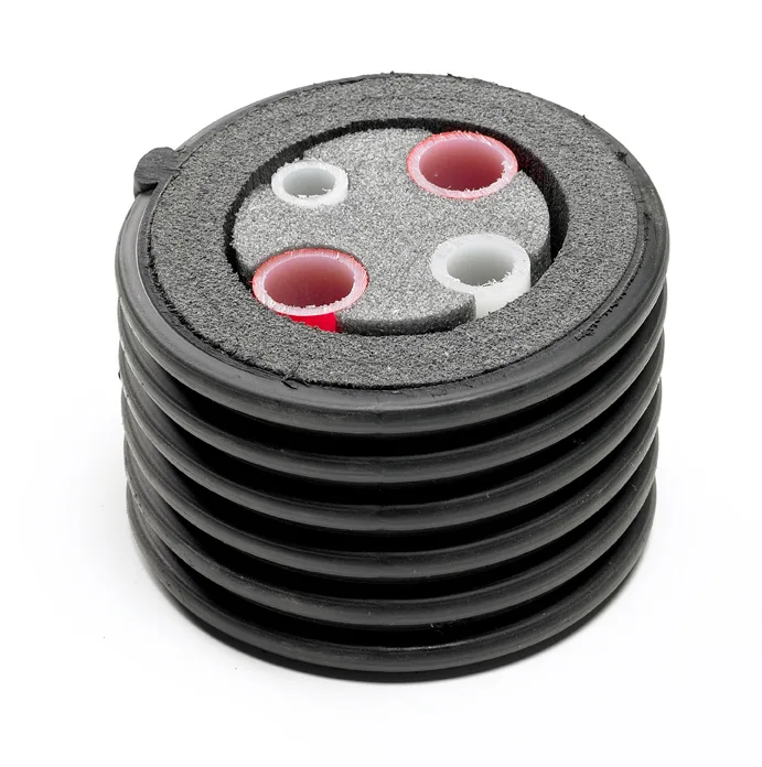 The corrugated polyethylene (PE) protective pipe of the MX-4-flex system provides high ring stiffness while maintaining a flexible structure. The cross-linked, closed-cell PEX foam used as insulation ensures excellent thermal insulation values (0.037 W/mK) and a flexible design. The flow pipes are made of cross-linked PEX, offering excellent thermal properties. The four-pipe structure of the MX-4-flex system allows for the installation of an insulated pipe system with less labor and in a smaller space.