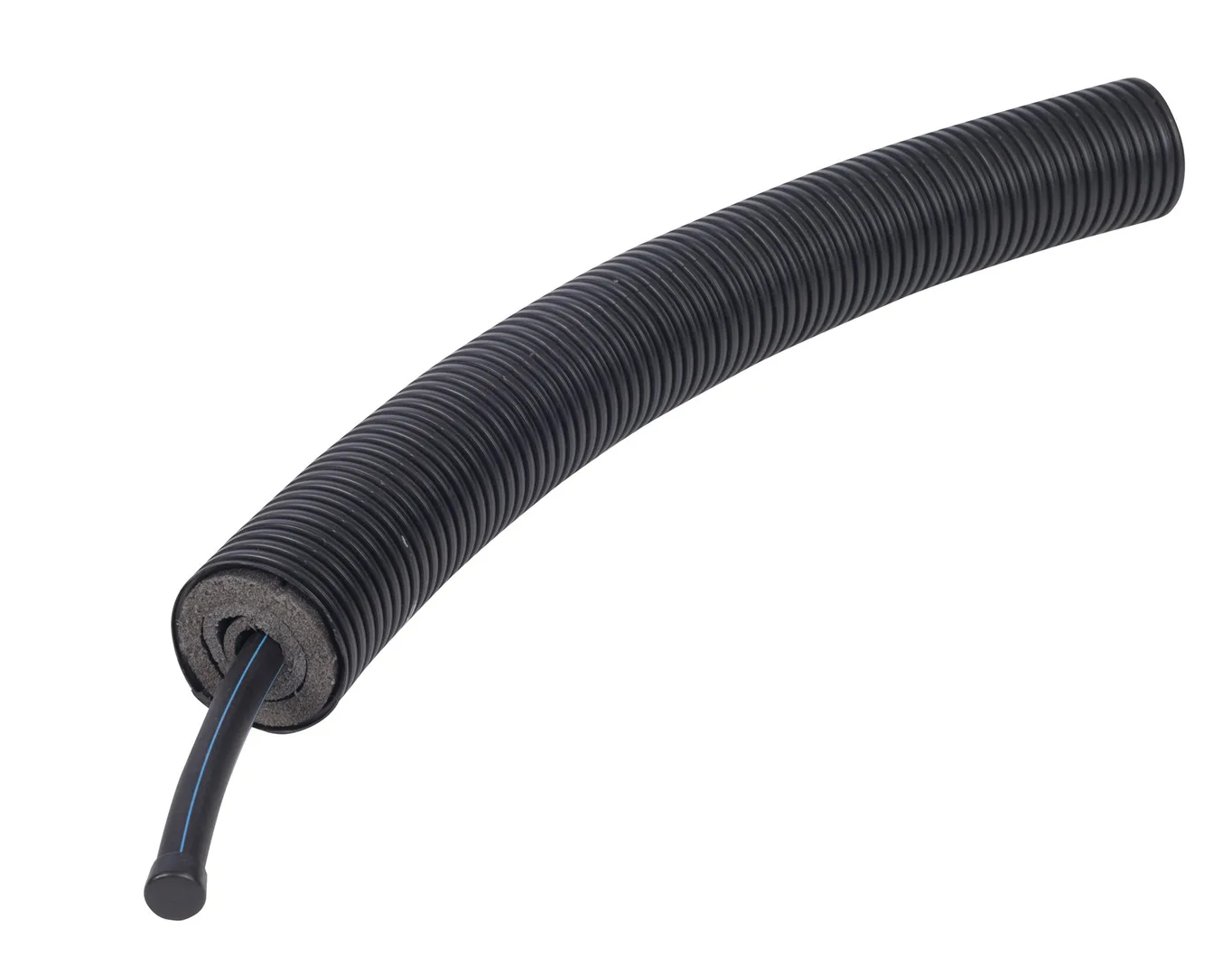 The corrugated polyethylene (PE) protective pipe of MX-Arctiflex provides high ring stiffness but maintains a flexible structure. The cross-linked, closed-cell PEX foam used as insulation ensures excellent thermal insulation values (0.037 W/mK) and a flexible design. The flow pipe is a PE pressure pipe with a PN10 pressure rating.