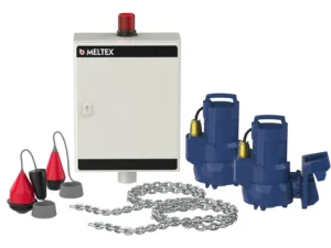 The configuration of the pumping station for wastewater or stormwater use is done with a separately purchased accessory package, which includes the required pumps, float switches, and control panel.