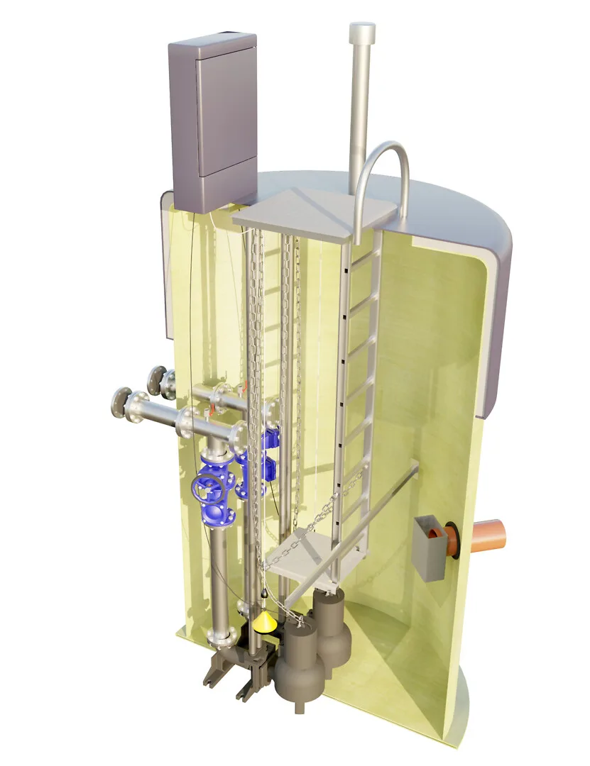 The pumps are lowered into the tank via a guide pipe, and the submersible float attached to the pump automatically connects to a switch box installed at the bottom of the tank. During maintenance, the pump is lifted up from the tank along the guide pipe. The lid of the pumping station, control center, control system, and other technical solutions are tailored according to the application and order.