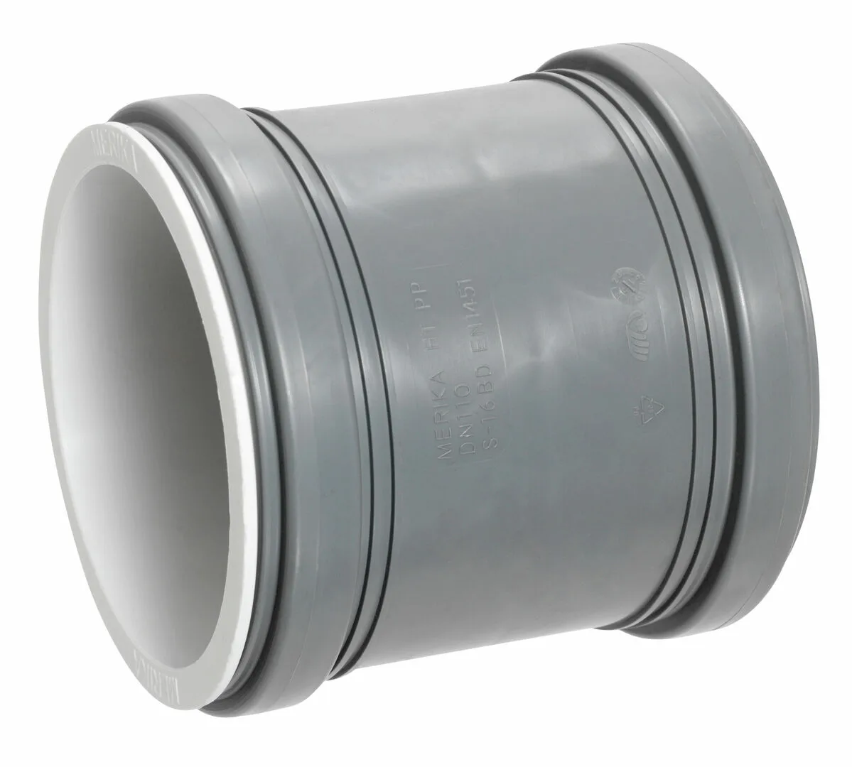 Socket reducer fitting with seal for watertight connection of 100 mm and 110 mm pipes and for reducing the diameter of the pipe line.