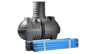 Distribution well for a wastewater system, placed between the septic tank and the soakaway field.