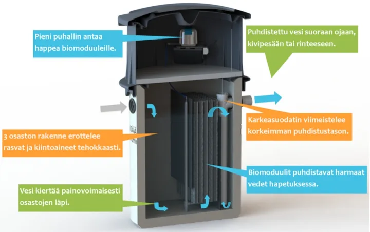 The Biopuhdistaja 3 treats all wastewater except toilet water. Thanks to its efficient design, gray water is treated in a single tank, eliminating the need for a settling tank or a separate field. The purified water can be directed straight to a ditch, gravel bed, or slope.