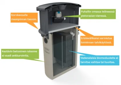 The Biopuhdistaja does not require filter materials, chemicals, or soil, making it an economical option. The sludge tank needs to be cleaned once a year. The Biopuhdistaja 3 is also suitable for winter use.