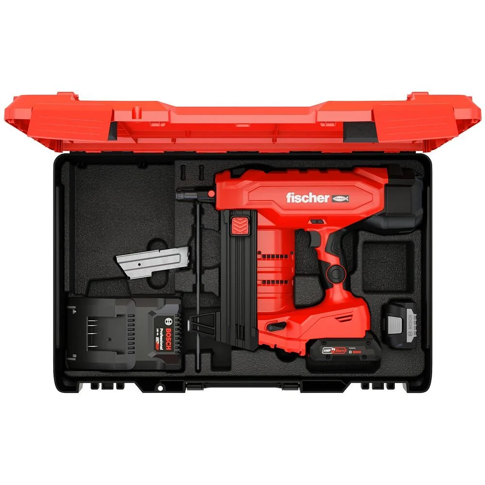 The Fischer FXC 85 is a battery-powered installation tool for quick and easy fastening to concrete and steel. The powerful 18-volt battery efficiently transfers energy to the nails, delivering a total of 85 joules. Additionally, the included Bosch battery is compatible with all AMPShare tools of the same voltage class. The nailer operates in a temperature range from -5°C to +50°C.
