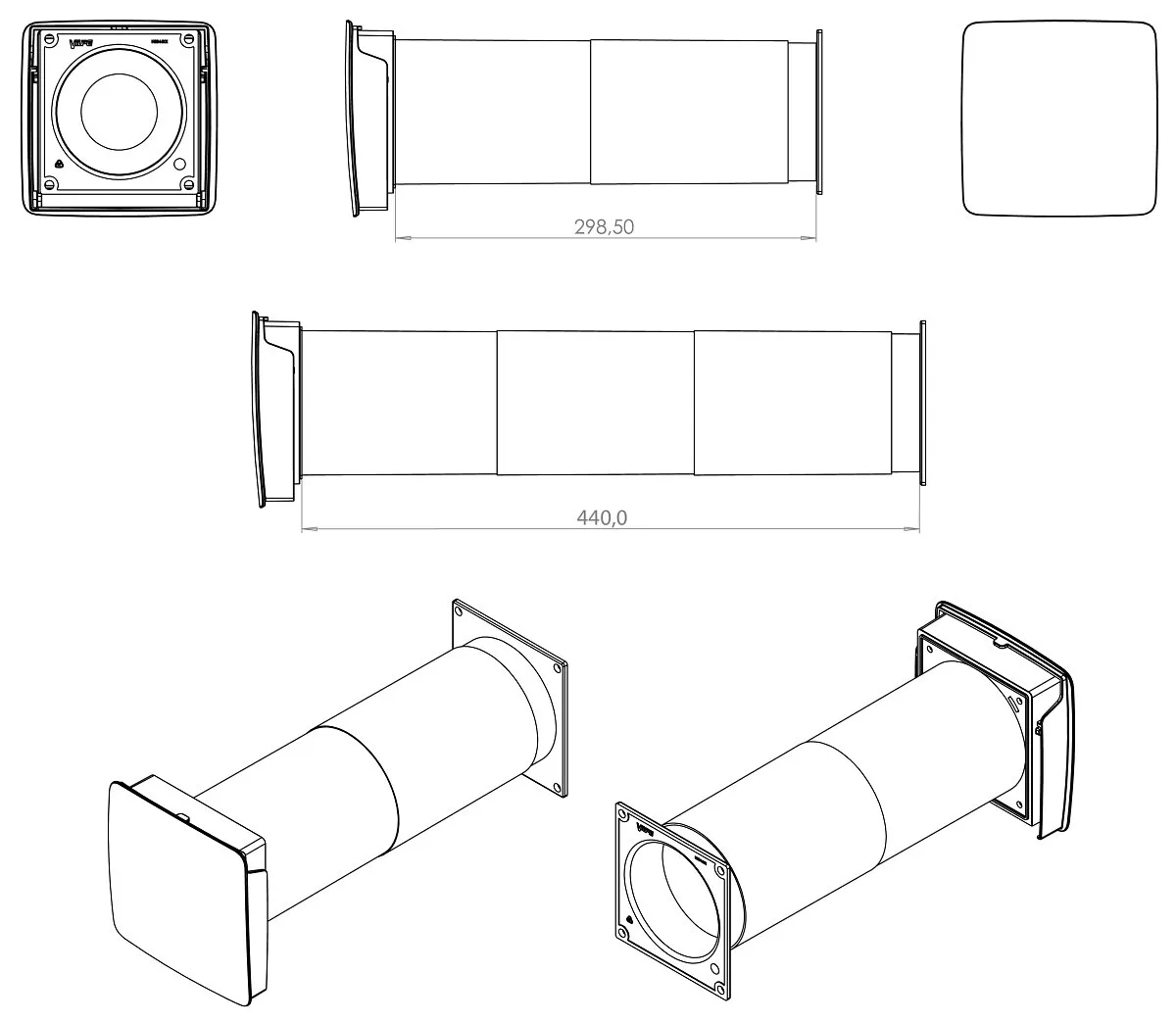 Dimensions: Valve 100 x 100 mm. Total length of pass-through pipes 440 mm, Multi-function outdoor grille 150 x 150 mm.