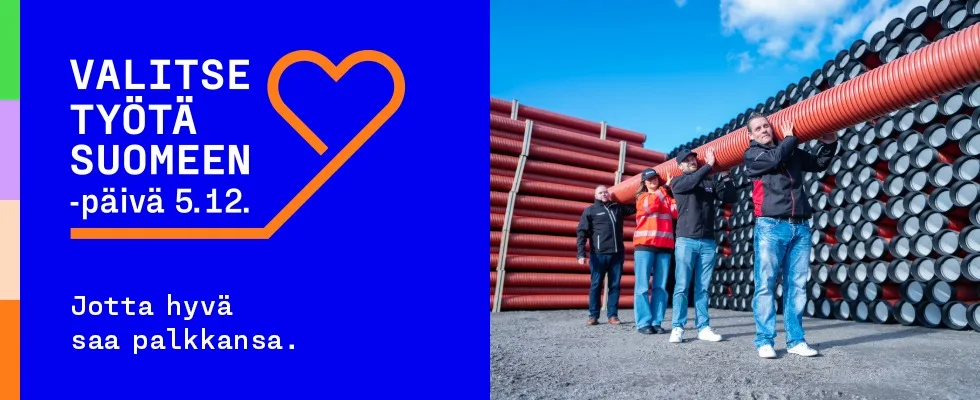 Valitse työtä Suomeen -päivää vietetään 5.12. Päivän tavoitteena on nostaa esiin suomalaisen työn merkitys ja muistuttaa kotimaisten valintojen vaikutuksista työllisyyteen, yritystoimintaan sekä yhteiskunnan toimivuuteen ja hyvinvointiin.
