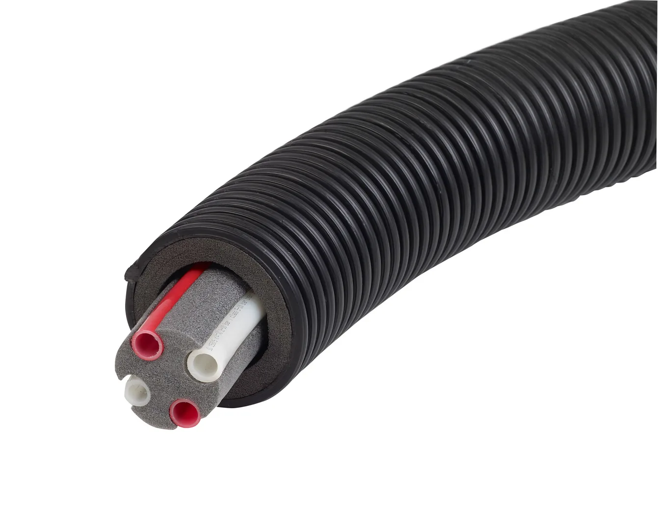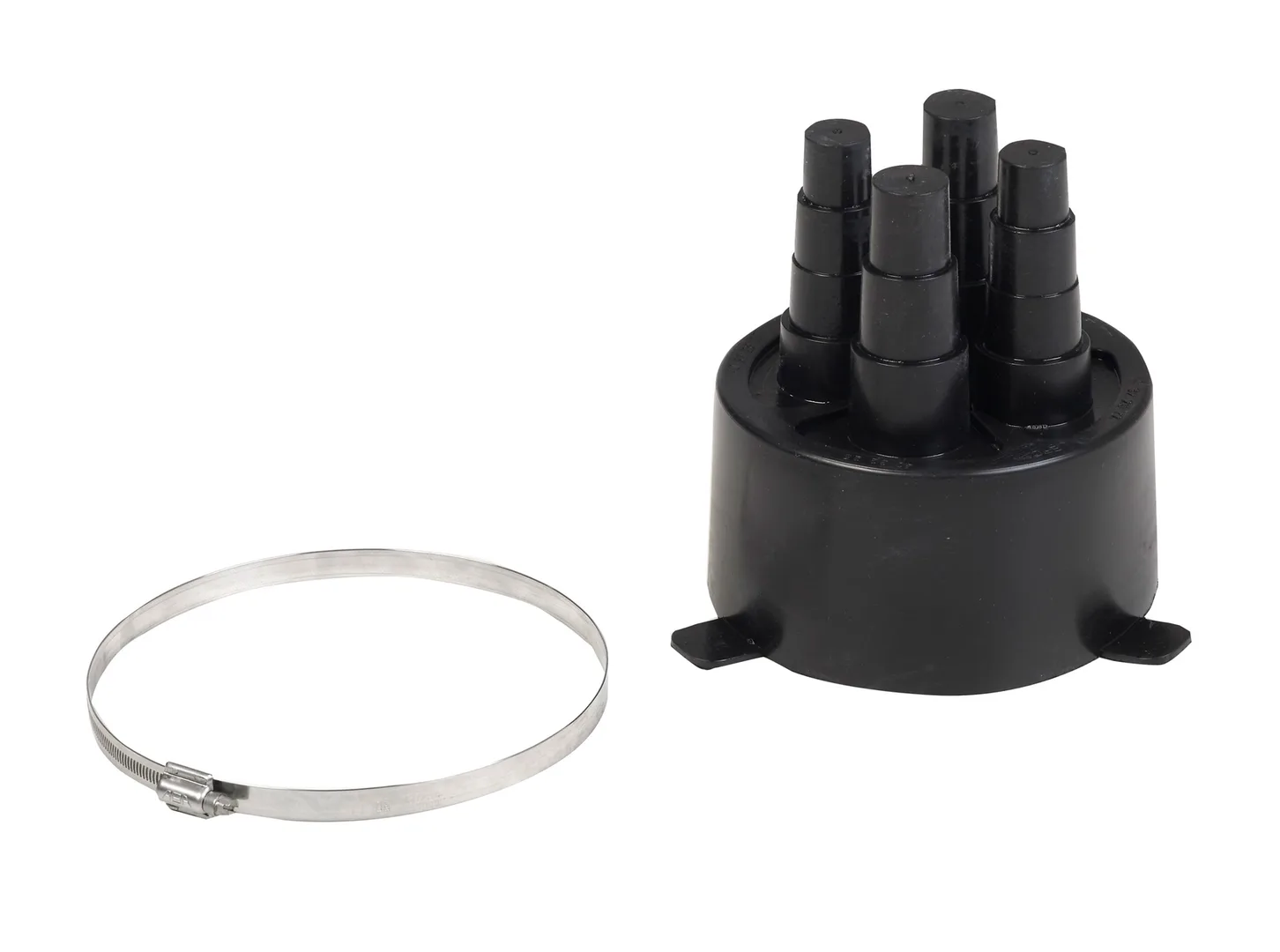 Päätyhattu neliputkiselle eristetylle lämpö- ja käyttövesiputkielementille.