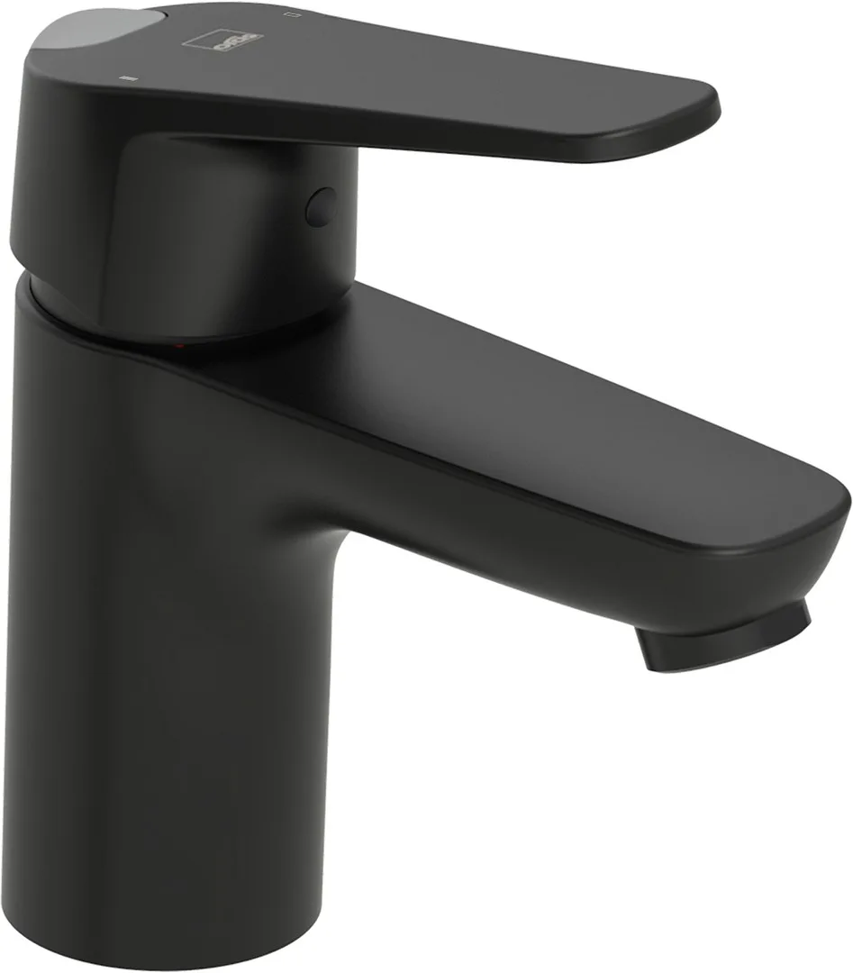 Pesuallashana jossa kiinteä juoksuputki. Hanan vivussa on veden lämpöä ja virtaamaa rajoittava ekonappi. Joustavat kytkentäputket. Mattamusta.