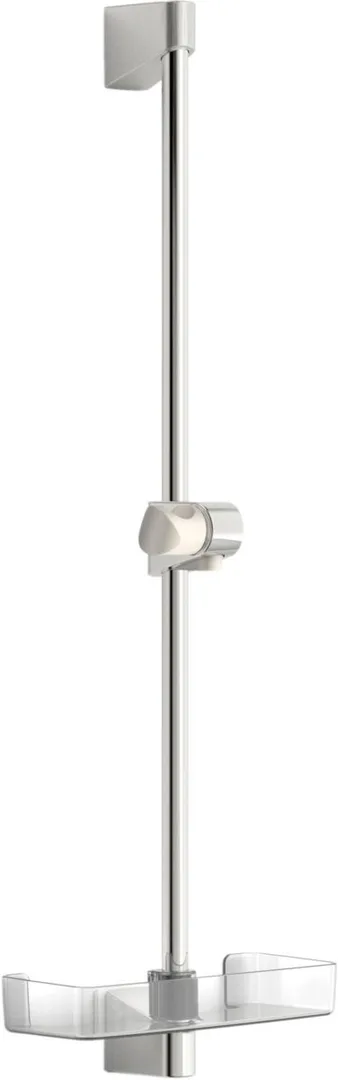 Kromattu suihkutankosarja, jossa on Ø18 mm suihkutanko, säädettävä suihkun kannatin ja saippuateline. Asennusleveys enintään 650 mm, korkeus 700 mm.