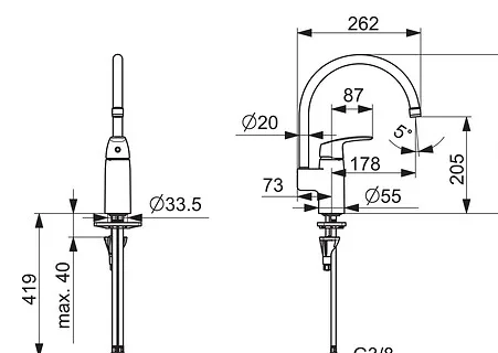 Oras 1038F Safira Keittiöhana. Hanassa kääntyvä, korkea juoksuputki 120° (mahdollista rajoittaa 0°tai 60°). Joustavat kytkentäputket.