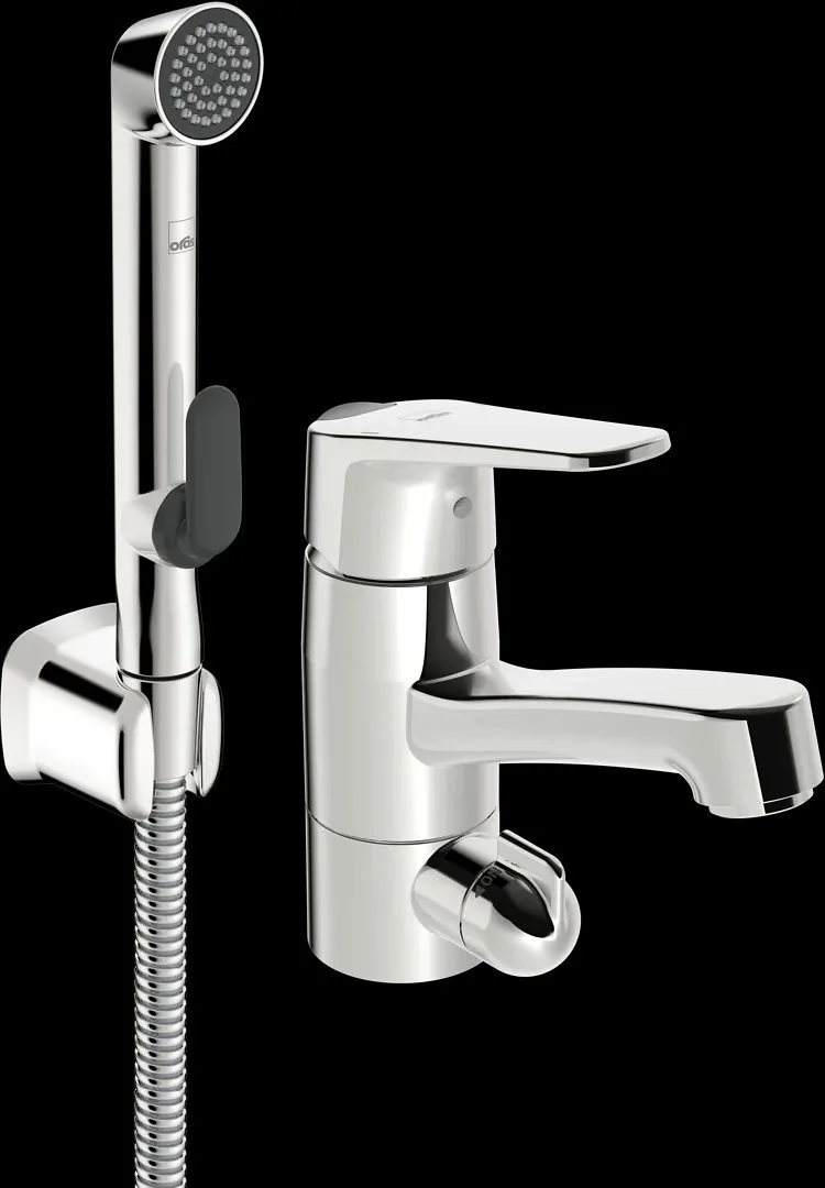 Pesuallashana jossa pesukoneventtiili, Bidetta-käsisuihku ja kääntyvä juoksuputki 120° (voidaan rajoittaa 40°- 80°). Hanan vivussa on veden lämpöä ja virtaamaa rajoittava ekonappi.
