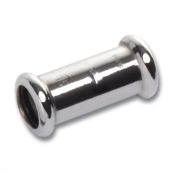 Kromattu puristuskaksoismuhvi käyttö- ja lämmitysvesiasennuksiin.