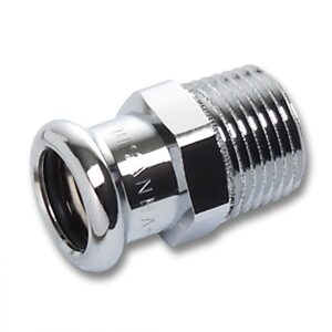 Kromattu puristusnippa ulkokierteellä käyttö- ja lämmitysvesiasennuksiin.