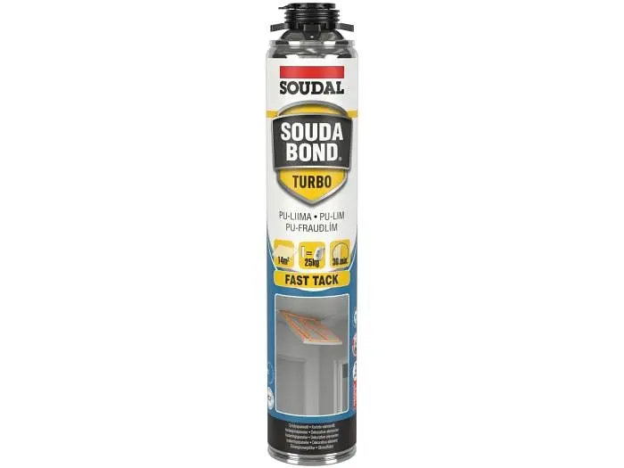 Soudabond Turbo on erittäin nopeasti kovettuva polyuretaanivaahtoliima, joka korvaa perinteiset laastipohjaiset liimat. Käyttövalmis ilman laastien sekoittamista. Soveltuu mm. eriste- ja kipsilevyjen puhtaaseen, tehokkaaseen ja taloudelliseen pysyvään liimaamiseen.