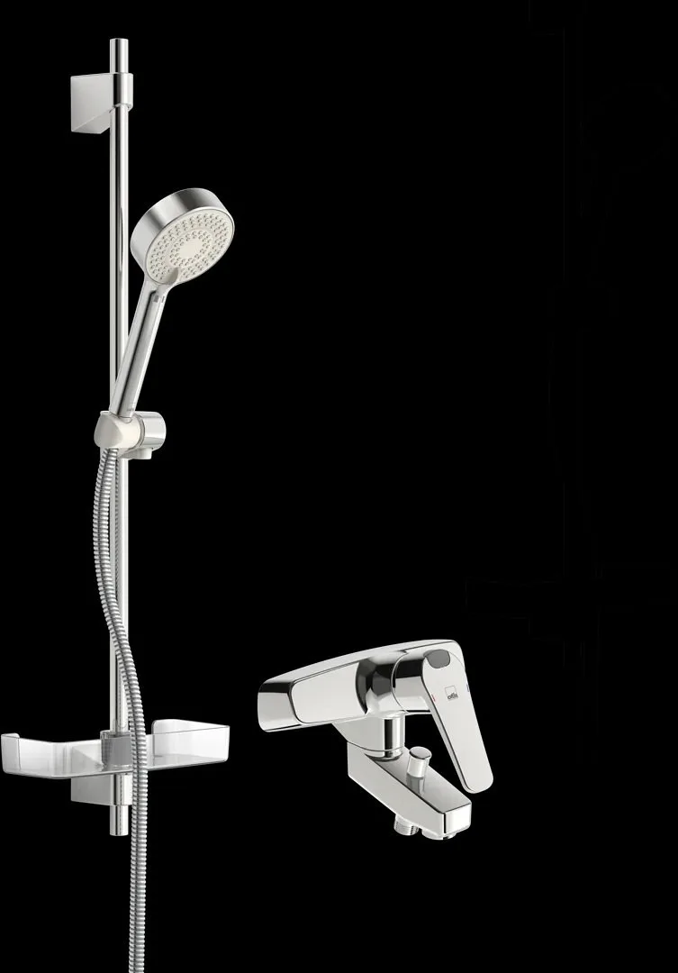 Badkar- och duschblandare med Oras Apollo duschset, omkastartapp och hållare. Blandarens spak har en ekoknapp som begränsar vattentemperatur och flöde. Oras Apollo duschsetet inkluderar duschstång (max. installationsavstånd 720 mm), duschslang (1,75 m) och tvålpip. Handduschen har tre inställningar (inklusive EcoFlow).